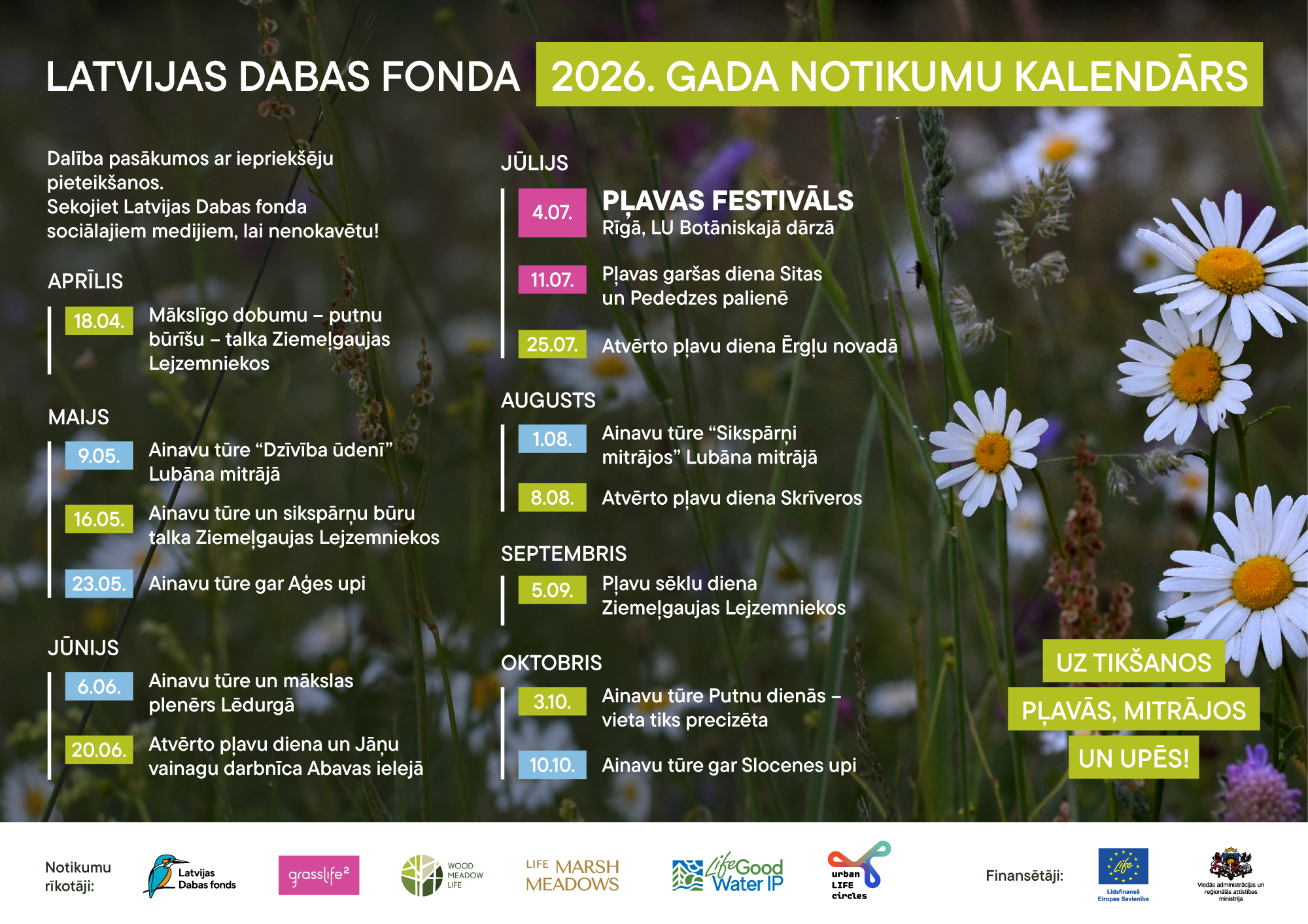 Latvijas Dabas fonds aicina sekot līdzi aktuālajai informācijai par pasākumiem www.ldf.lv un sociālajos medijos. Pieteikšanās uz katru pasākumu notiek atsevišķi, un tā tiek izziņota aptuveni divas nedēļas pirms konkrētā pasākuma norises.